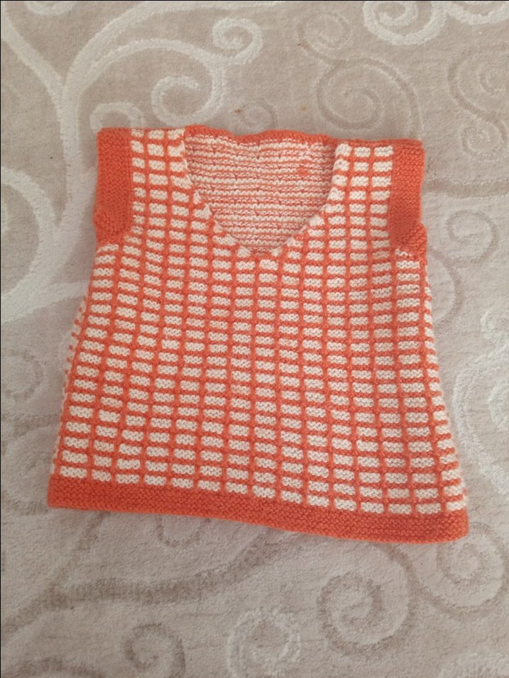 Renkli turuncu örgü kız çocuk süveter, salaş kesim ve kayık yaka ile tasarlanmıştır. Kolsuz ve sade, normcore tarzındadır. el yapimi dir