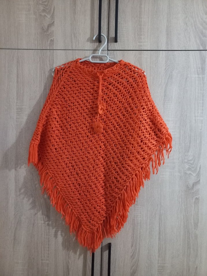 Turuncu renkli, örgü kız panço bol kesim, bisiklet yaka ve askılı kolludur. Bohem tarzı, püsküllü kenarlarıyla retro bir görünüm sunar.
