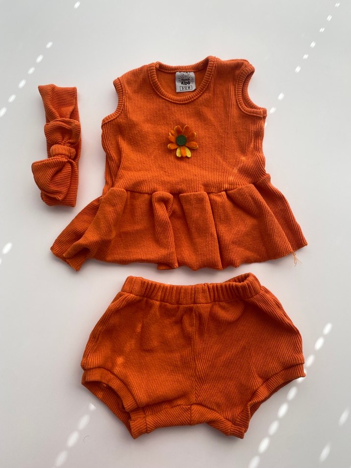 Turuncu örgü kumaştan oluşan bu bebek kız takımı kolsuz üst, çiçek detaylı, şort ve saç bandından oluşur. Rahat ve yumuşaktır. 9.12 aylıktır
