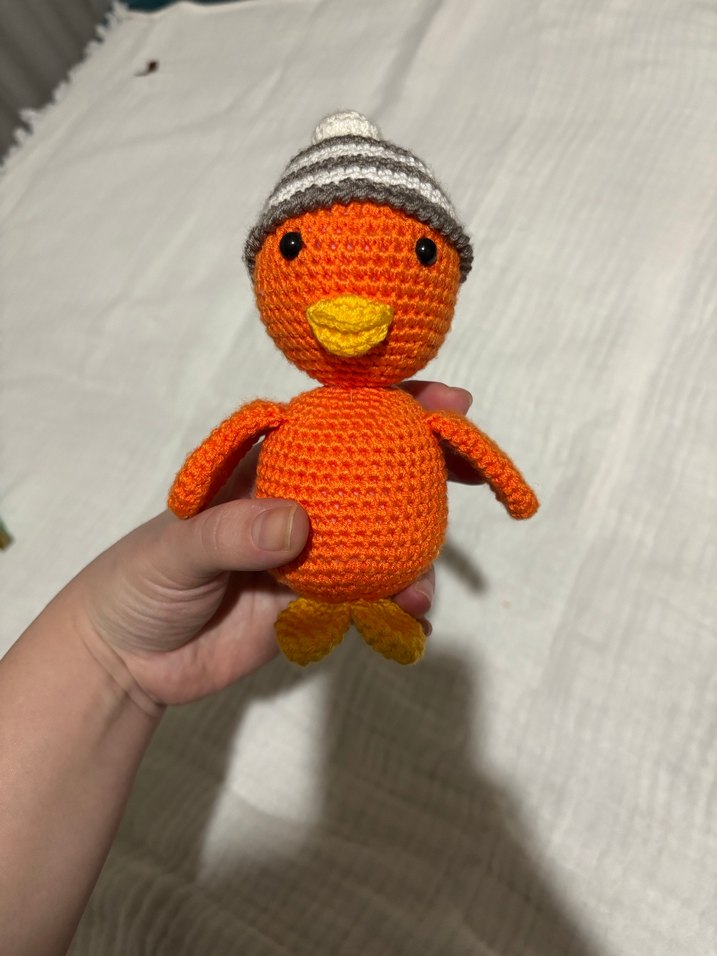 Renkli turuncu örgü oyuncak ördek, sarı gagalı ve ayaklı, çizgili şapkalı, yumuşak ve el yapımıdır. 17 cm