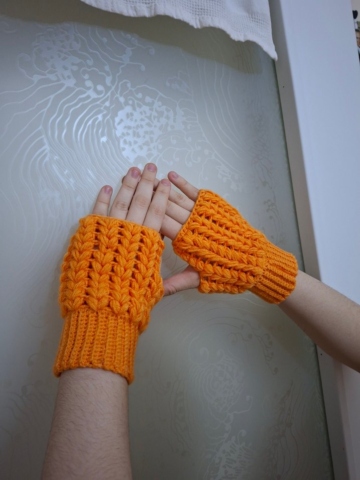 Renkli turuncu örgü parmaksız eldivenler, rahat ve bohem tarzıyla retro, karşı kültür havası sunar. Konforlu ve özgün bir görünüm için ideal.