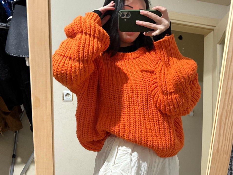 Parlak turuncu örgü kumaştan, salaş kesimli, uzun kollu ve bisiklet yakalı rahat kadın kazak.