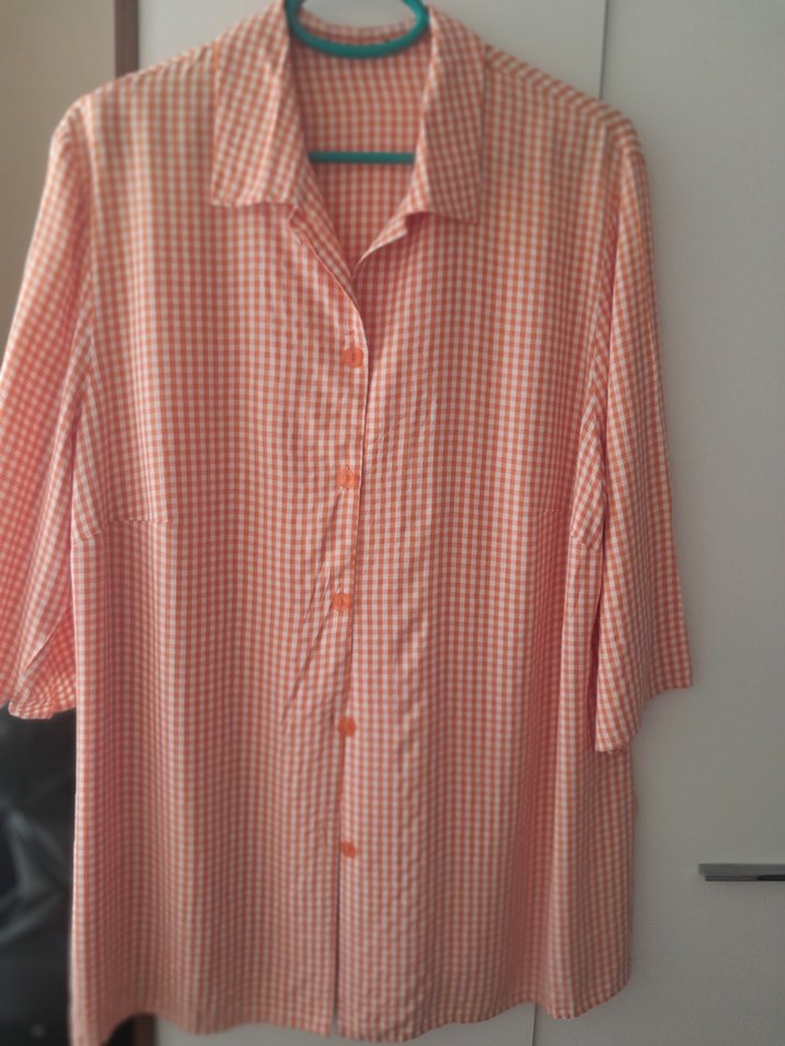 Turuncu pastel renkte, pamuklu, düğmeli, yakalı, kısa kollu ve midi boyda bol kesim gömlek. Rahat ve sade normcore tarzda bir parça.