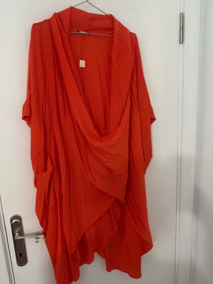 İpekimsi dökümlü kumaştan, salaş kesim uzun kollu, drapeli V yakalı, çağdaş ve avangard tarzda kadın pareo ister elbise ister tunik olarak kullanılır foto için bir kez giydim .