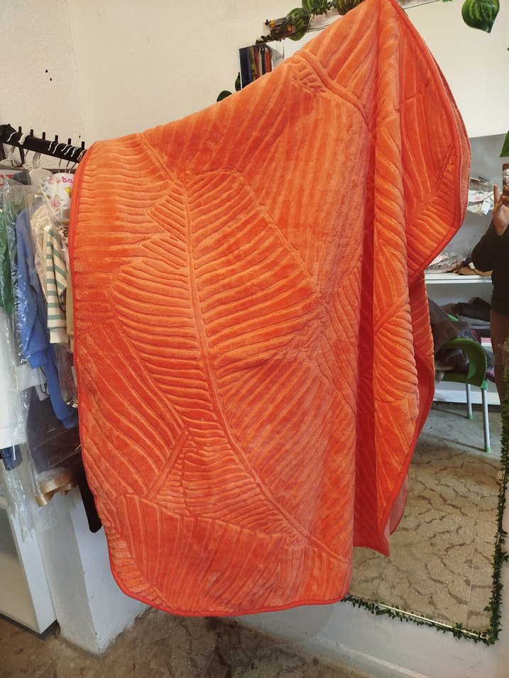 Parlak turuncu renkte, yumuşak ve sıcak hissettiren, kabartmalı yaprak desenli battaniye.