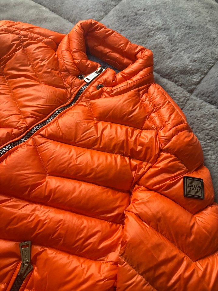 Fitted kesim, parlak turuncu erkek kışlık mont, notched lapel yakaya.Gizli yağmurluk kapşon yakasında fermuarlı bölmede mevcut.Sokak modasına uygun, rahat ve şık bir tasarımdır.