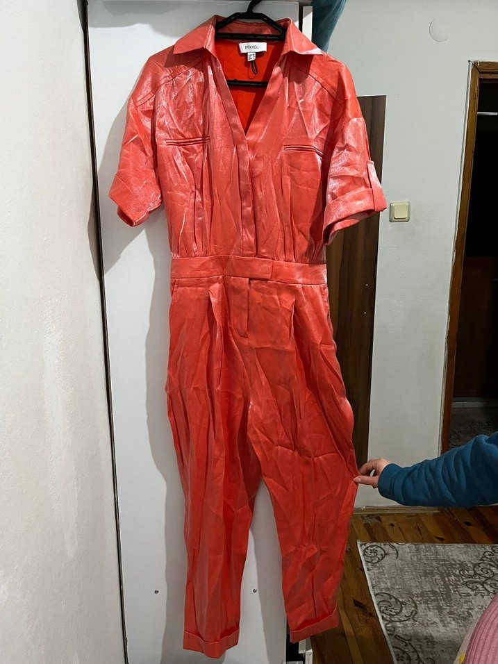 Bu turuncuı, parlak ve tulum, kısa kollu ve yakalıdır. Avant-garde sokak tarzı için idealdir ve dış mekan kullanımı için uygundur.
