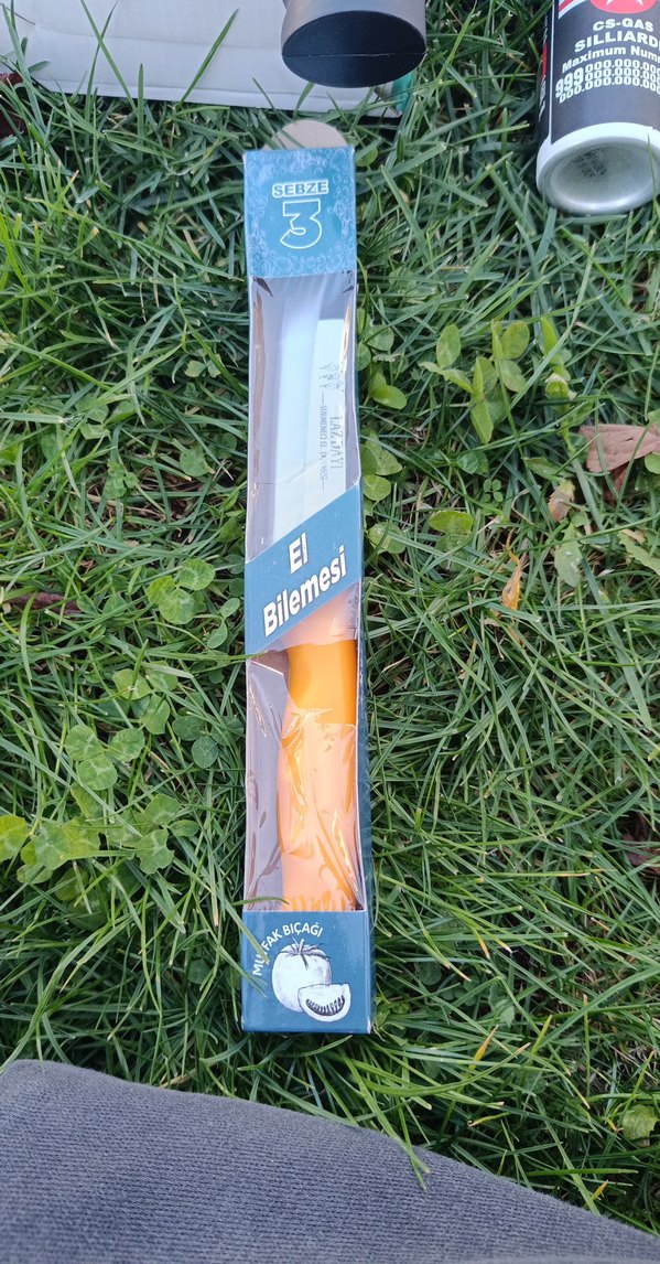 Parlak turuncu renkte, yemek için tasarlanmış keskin bir bıçağı vardır.