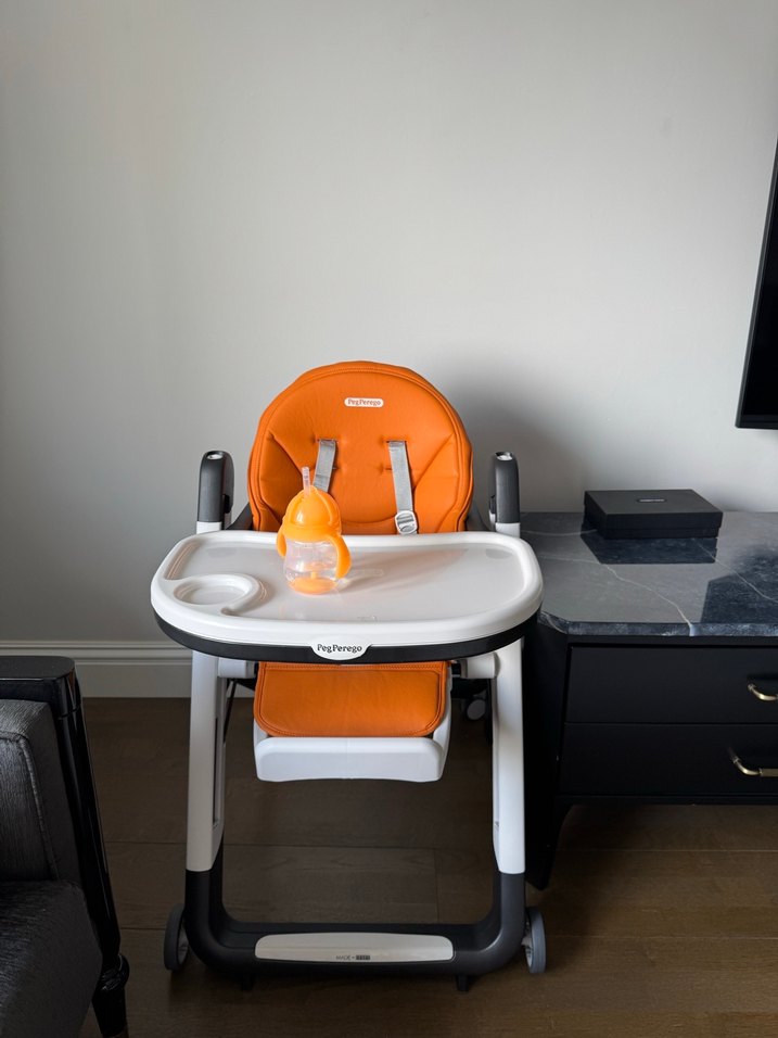 Bu mama sandalyesi, turuncu oturma kısmı ve gri çerçeve detaylarına sahiptir. Güvenlik kemeri ve çıkarılabilir tepsi içerir. Rahatlık ve pratiklik sağlar. Ürün sıfır ayarındadır . Hiçbir deformesi bulunmamaktadır
