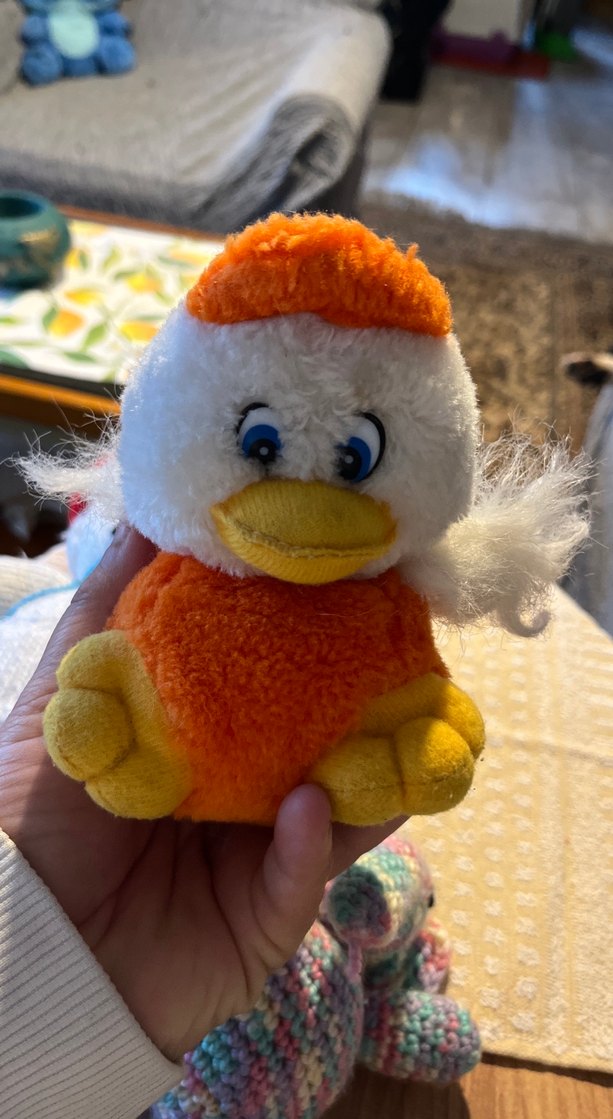 Turuncu gövdesi ve beyaz başı olan yumuşak ve renkli peluş ördek oyuncak. Mavi gözleri ve sarı gagası ile ayakları bulunur.