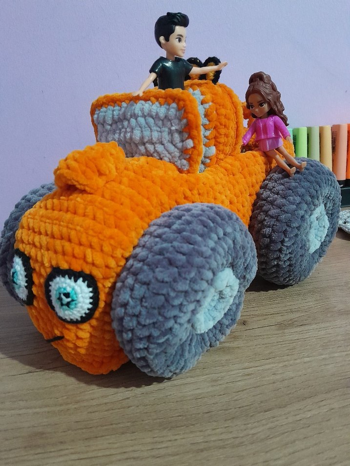 Turuncu ve gri renklerde, büyük tekerlekli ve sevimli gözlü renkli peluş oyuncak traktör. Yumuşak ve sarılmalık.