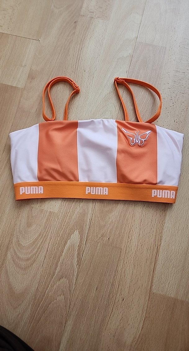 Ayarlanabilir askılı, turuncu ve beyaz çizgili Puma spor sütyeni, baskılı kelebek detayıyla athleisure tarzına uygundur.