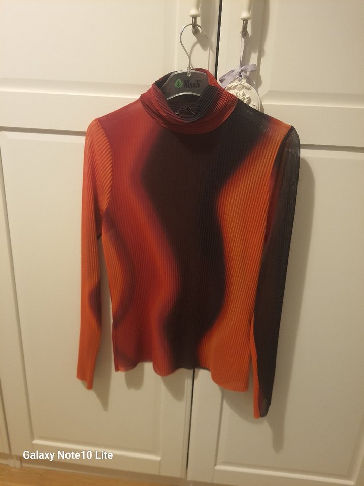 Kırmızı ve koyu tonlarda tie-dye desenli, pilili, balıkçı yaka ve uzun kollu, vücuda oturan kadın bluz. Sentetik kumaştan, çağdaş tarzda, günlük kullanıma uygun.