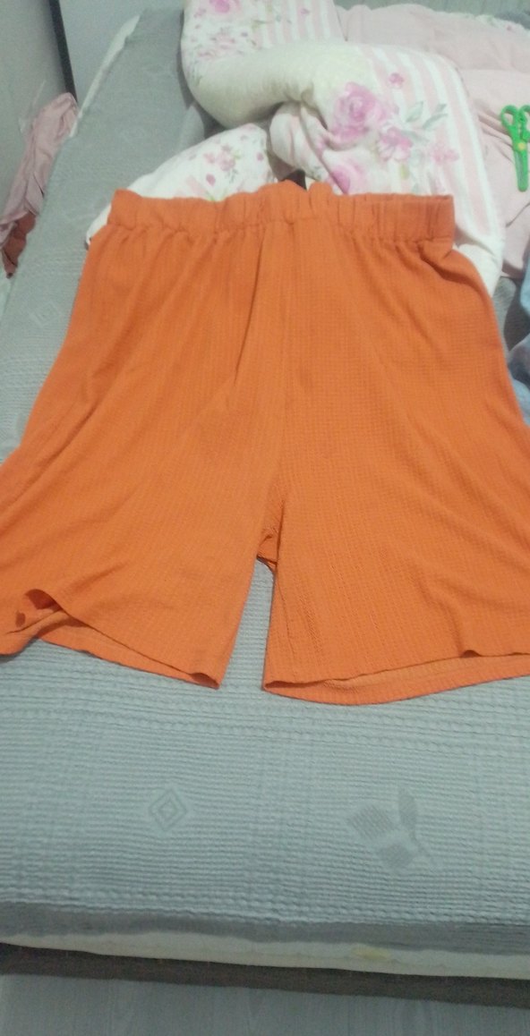 Pastel turuncu renkli, bol kesim pilili hamile mini şort, yumuşak sentetik kumaştan üretilmiştir, günlük kullanıma uygundur.