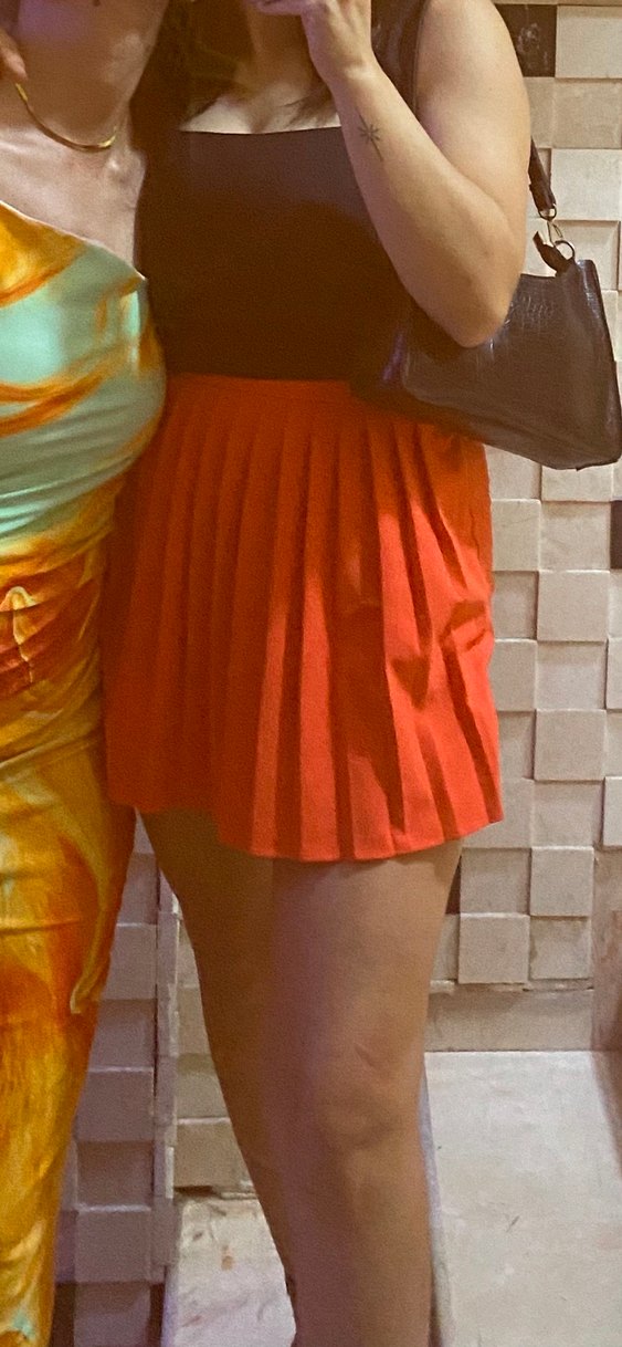 Parlak turuncu renkte, sentetik kumaştan yapılmış, pilili ve vücuda oturan mini etek. Günlük rahat sokak stili için uygundur. Şort etek