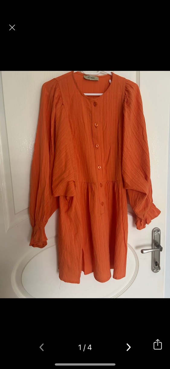 Bu turuncu parlak keten tunik, pilili ve uzun kollu olup, V yaka ve düğmeli detaylara sahiptir. Salaş kesimi bohem tarzı yansıtır.