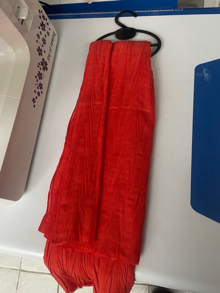 Keten kumaştan, parlak turuncu renkte ve drapeli kadın şalı. Bohem ve minimalist tarzlara uygundur.