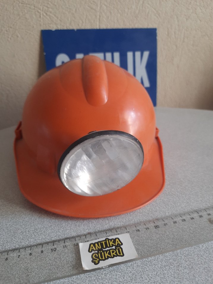 Turuncu plastik kaskı, tokalı kayışlıdır. Önünde ışığı vardır
