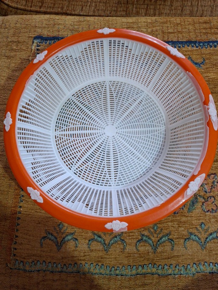 Turuncu kenarlı ve beyaz çiçek detaylı renkli plastik mutfak süzgeci, etkili süzme için ince yapıya sahiptir.