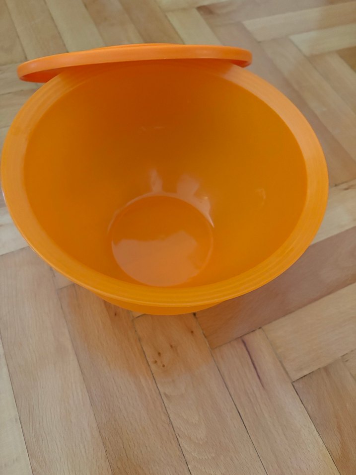 Renkli turuncu plastik saklama kabı, kapaklıdır ve mutfakta farklı amaçlar için kullanılabilir. İçinde çizik var iki noktada iyi durumda