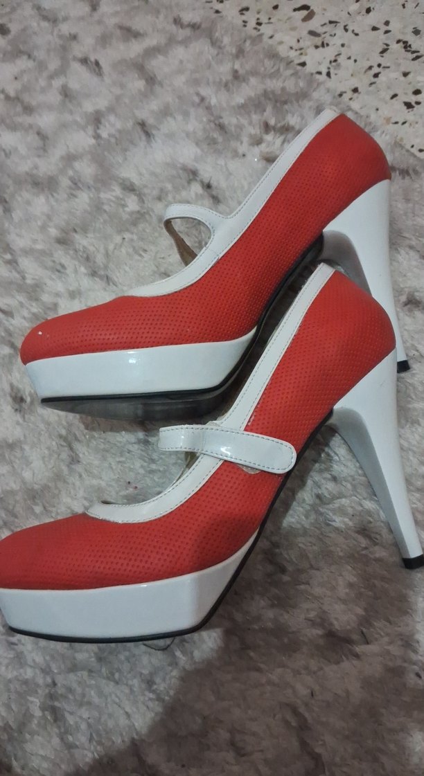 turuncu, renkli baskılı ve tokalı platform topuklu stiletto. Kauçuk malzemeden, romantik akşamlar için çağdaş tarzda.