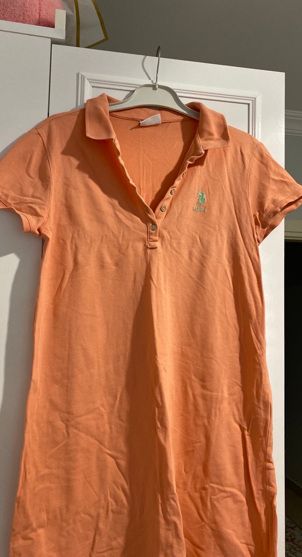 Bu fitted polo elbise , yakalı ve kısa kollu, yumuşak keten kumaştan pastel turuncu renkte. Düğme detaylı ve hafif logo nakışlı, trend sokak stili için uygundur.