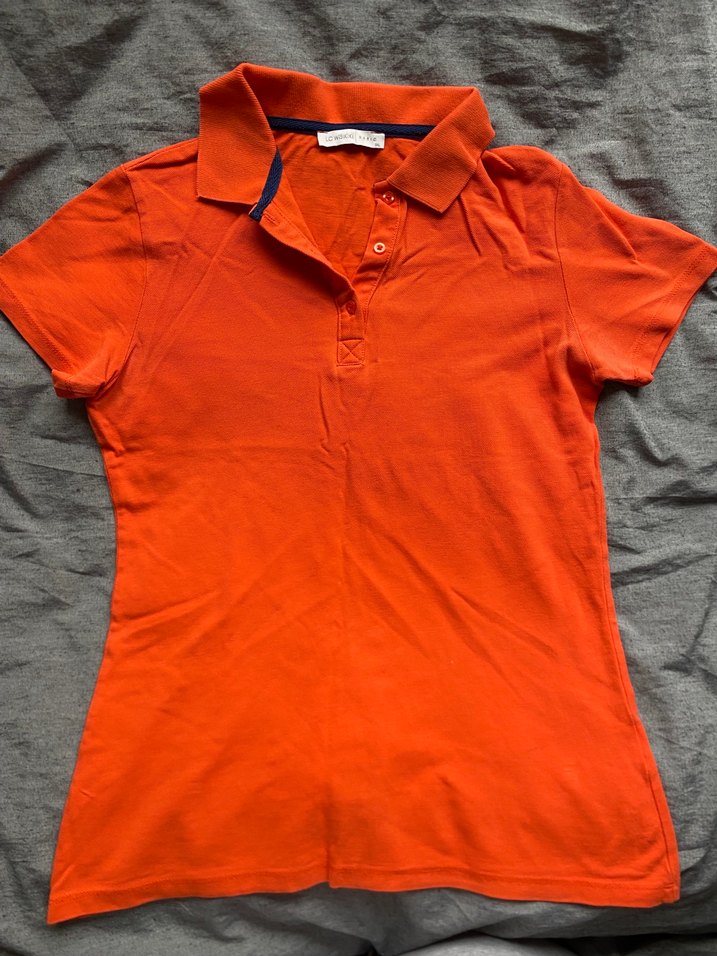 Turuncu renkli, kısa kollu, polo yaka ve vücuda oturan kesime sahip tişört Yumuşak sentetik kumaştan üretilmiştir. Hiçbir kusuru yok. 3xl yazıyor ama bence S M