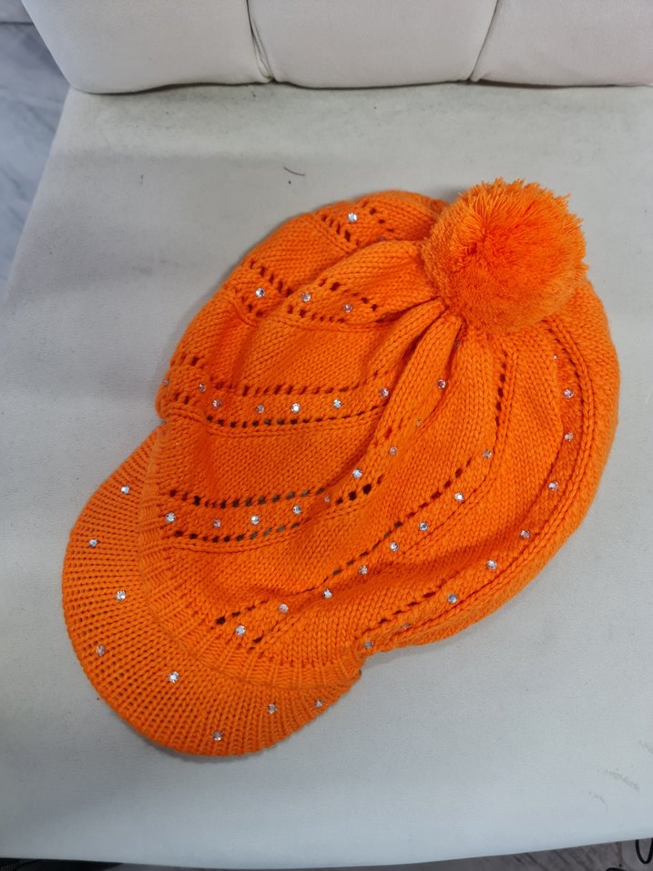 Kadınlar için turuncu renkli, ponponlu ve küçük boncuklarla süslenmiş örgü bere, rahat ve retro tarz sunar. #bohem #bere #sacaksesuarı #şapka