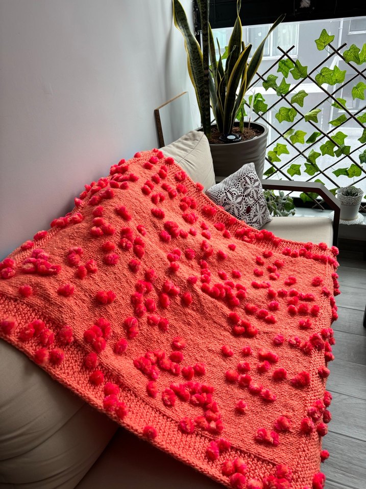 Yumuşak dokulu, turuncu renkli örgü çocuk battaniyesi, dekoratif ponponlarla süslenmiştir, sıcaklık ve konfor sağlar.