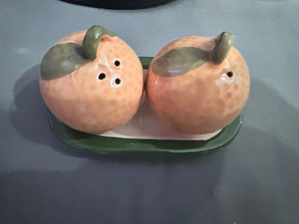Turuncu portakal şeklinde tuzluk ve biberlik ile birlikte tepsi seti, mutfağınıza renkli bir dokunuş katıyor.