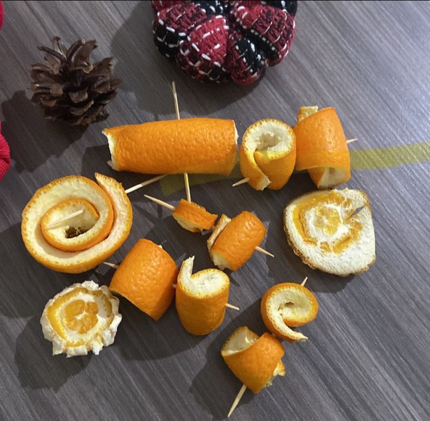 diş çubuklarıyla tutturulmuş, desen içermeyen turuncu portakal kabuğu dilimleri, sofra dekorasyonu için uygun.