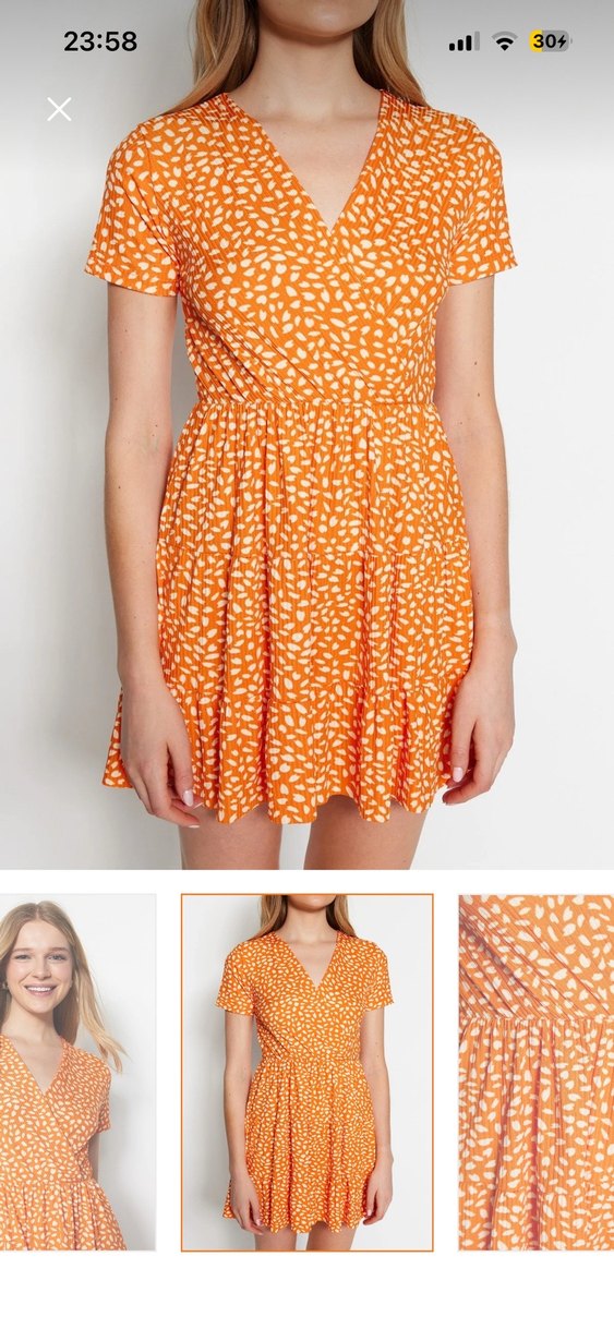 Turuncu renk, V yaka ve kısa kollu, vücuda oturan midi elbise.Sadece 1kez giydim yeni bir şekilde duruyor.