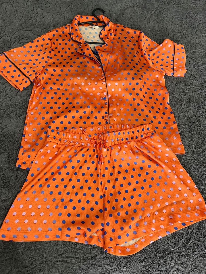 Parlak turuncu kumaş üzerine mavi puantiyeli, kısa kollu ve şortlu bol kesim kadın pijama takımı.