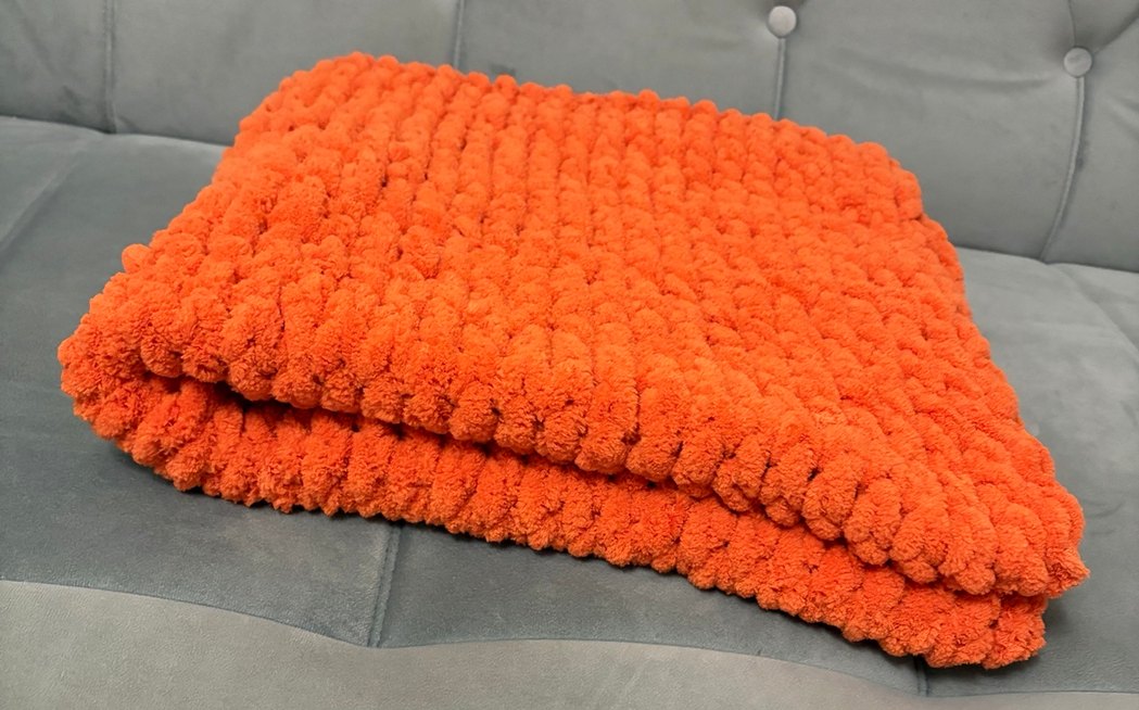 Turuncu renkte, yumuşak yün malzemeden üretilmiş çocuk battaniyesi. Desensiz ve sıcak tutar.