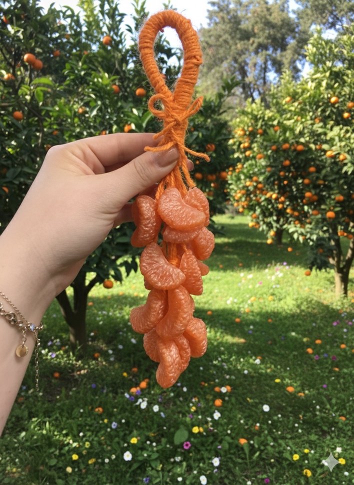 Turuncu renkli, nakışlı ve püsküllü detaylara sahip bohem tarzda kadın el zinciri, açık hava kullanımı için uygundur.