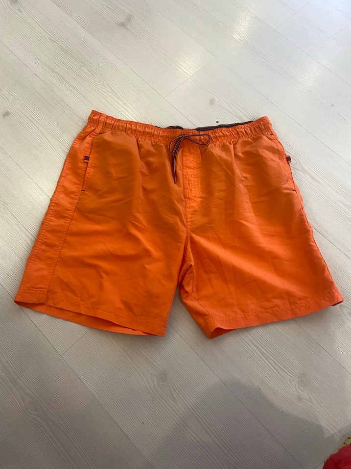 Parlak turuncu renkte, rahat kesim erkek mini şort. Düz ve sade tasarımıyla plajda zahmetsiz şıklık sunar.