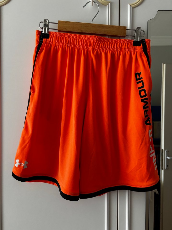 Turuncu renkli, rahat kesim ve midi boy erkek spor şortu. Sentetik kumaştan üretilmiş, sportif ve sokak stiline uygun, Under Armour logosu ile dikkat çeker. Sadece yazısının altında küçük bir yerde bir leke mevcut onun haricinde deformasyonu yoktur fotoğrafları büyüterek inceleyebilirsiniz