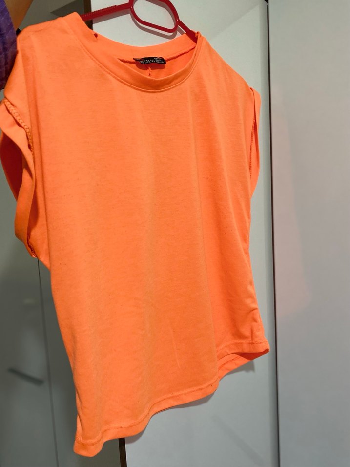 Turuncu renkte, yuvarlak yakalı ve kısa kollu kadın tişörtü. Rahat kesim ve yumuşak sentetik kumaştan, günlük sokak stili için uygun.