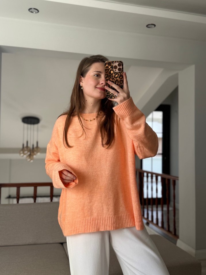 Turuncu, örme kumaştan, uzun kollu, bol kesim, yuvarlak yaka kadın kazak. Rahat ve şık, günlük kullanıma uygun.