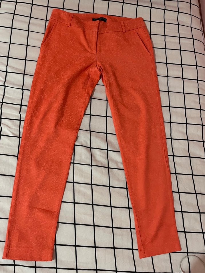 Turuncu renkte, regular fit ve midi boy kadın kumaş pantolon. Yumuşak sentetik kumaştan, günlük rahat kullanım için uygun, streetwear ve athleisure tarzında.