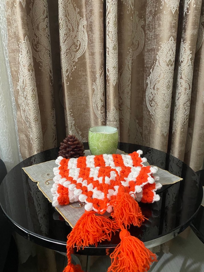 Turuncu renkli, dokulu tasarıma sahip, tutuş ve peeling için püsküllü banyo süngeri.