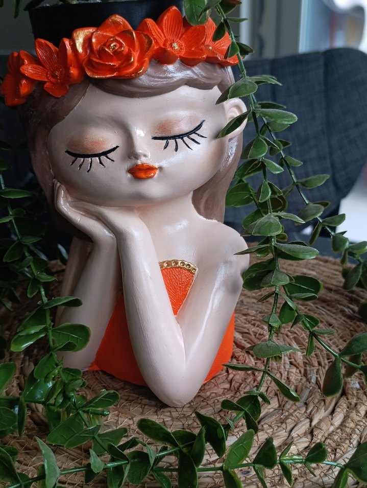 Turuncu dudakları, kapalı gözleri ve çiçekli tacı olan renkli bir biblo. Her mekana şirinlik katar.