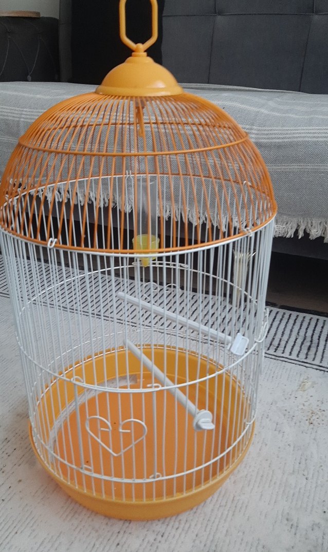 Canlı turuncu üst ve tabana sahip, beyaz çubuklu renkli kuş kafesi. Taşıma kulpu ve iç kısmında tünek bulunur. iyi durumda her türlü kuş ve hayvan bakila bilir çok iyi durumda sadece bir yerinde hafif bir sürtünme var eliminden geldiğince temizledi kırığı çatlağı yok r