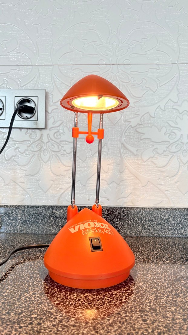 Ayarlanabilir başlıklı, tabanında açma-kapama düğmesi olan turuncu renkli masa lambası. Odaklanmış ışık sağlar.