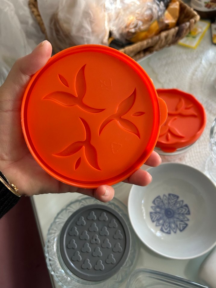 Turuncu renkli, çiçek desenli renkli meme pedi. Yumuşak ve esnek malzemeden üretilmiştir.
