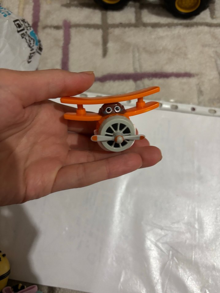 Canlı turuncu renkte, çift kanatlı ve pervaneli küçük uçak figürü, gözleriyle dikkat çekiyor. ✈️