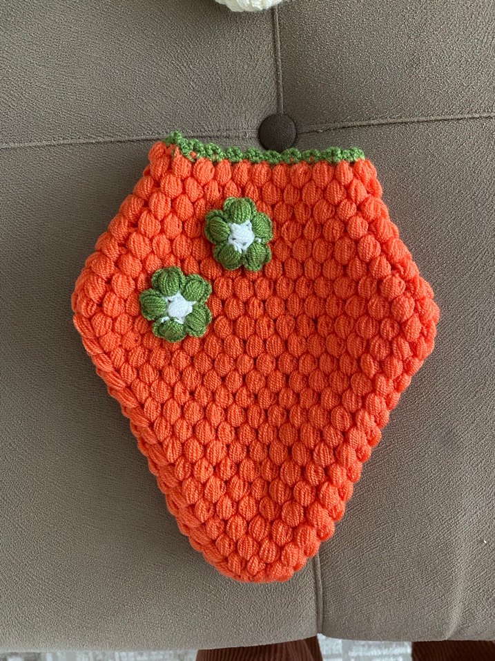 Turuncu renkte, dokulu örgüden yapılmış, yeşil ve beyaz çiçek detaylı renkli banyo lifi Yumuşak ve nazik temizlik sağlar.