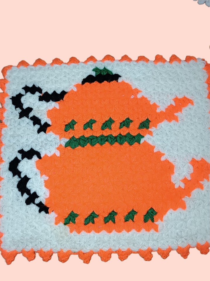 Turuncu taban ve desenlere sahip el örgüsü renkli banyo süngeri, yumuşak dokusuyla banyo için uygundur.