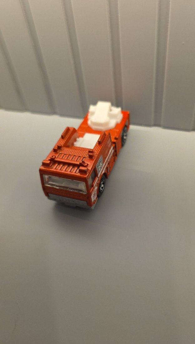 Canlı turuncu renkte, beyaz detaylı ve gerçekçi tekerleklere sahip oyuncak itfaiye arabası.