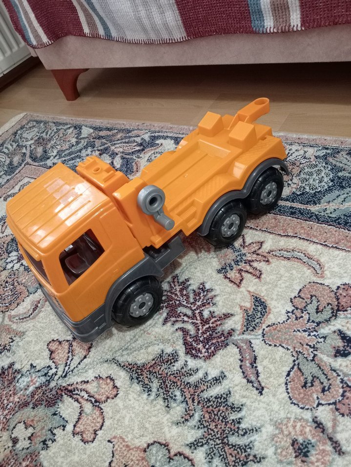 Canlı turuncu renkte, altı tekerlekli ve detaylı kabinli oyuncak kamyon. elazig olursa elden teslim de edilir